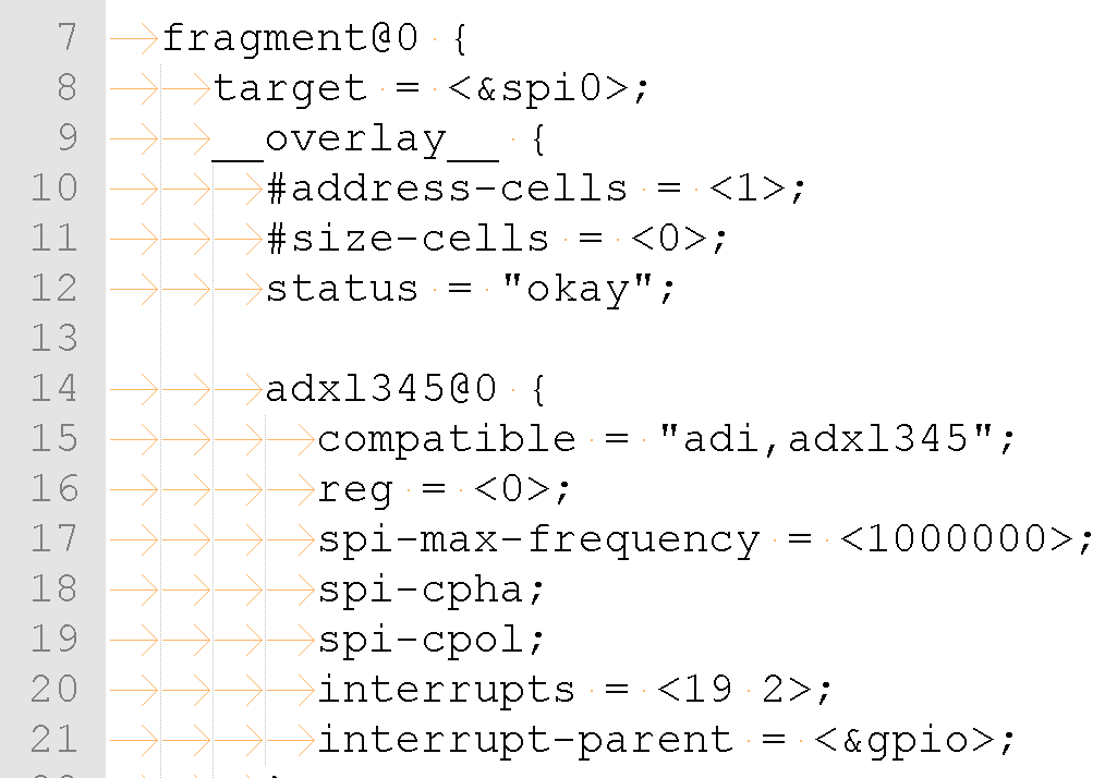 While you won’t have to do anything more than editing a couple of files in this tutorial, it helps to understand a bit about what is going on under the surface. A “Device Tree” contains information about a system’s hardware - what peripherals exist (like displays, memory, USB, Ethernet controllers, GPIO pins, etc.) A “Device Tree Overlay” contains information about additional connected hardware, like our ADXL3x5/LM75. Figure 9 shows a screenshot of the ADXL345’s overlay source. It shows that the ADXL345 is connected to the SPI port, using the first CS signal (CS0), the maximum SPI clock frequency is 1MHz, and the interrupt signal is connected to Pin 19 (as shown in the connection diagram above.)