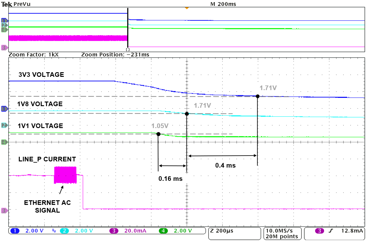 The capture for the power shut down sequence of LINE_P current and the main three supply voltages for the microcontroller, following the threshold or the minimum reset voltages of each supply: The time between 3V3 (min = 1.71V) and 1V8 (min = 1.71V) is 0.4ms, between 3V3 (min = 1.71V) and 1V1 (min = 1.05V) is 0.56ms and between 1V8 (min = 1.71V) and 1V1 (min = 1.05V) is 0.16ms. It is also following the correct sequence for shutdown being 1V1 first, 1V8 second and 3V3 third or last.