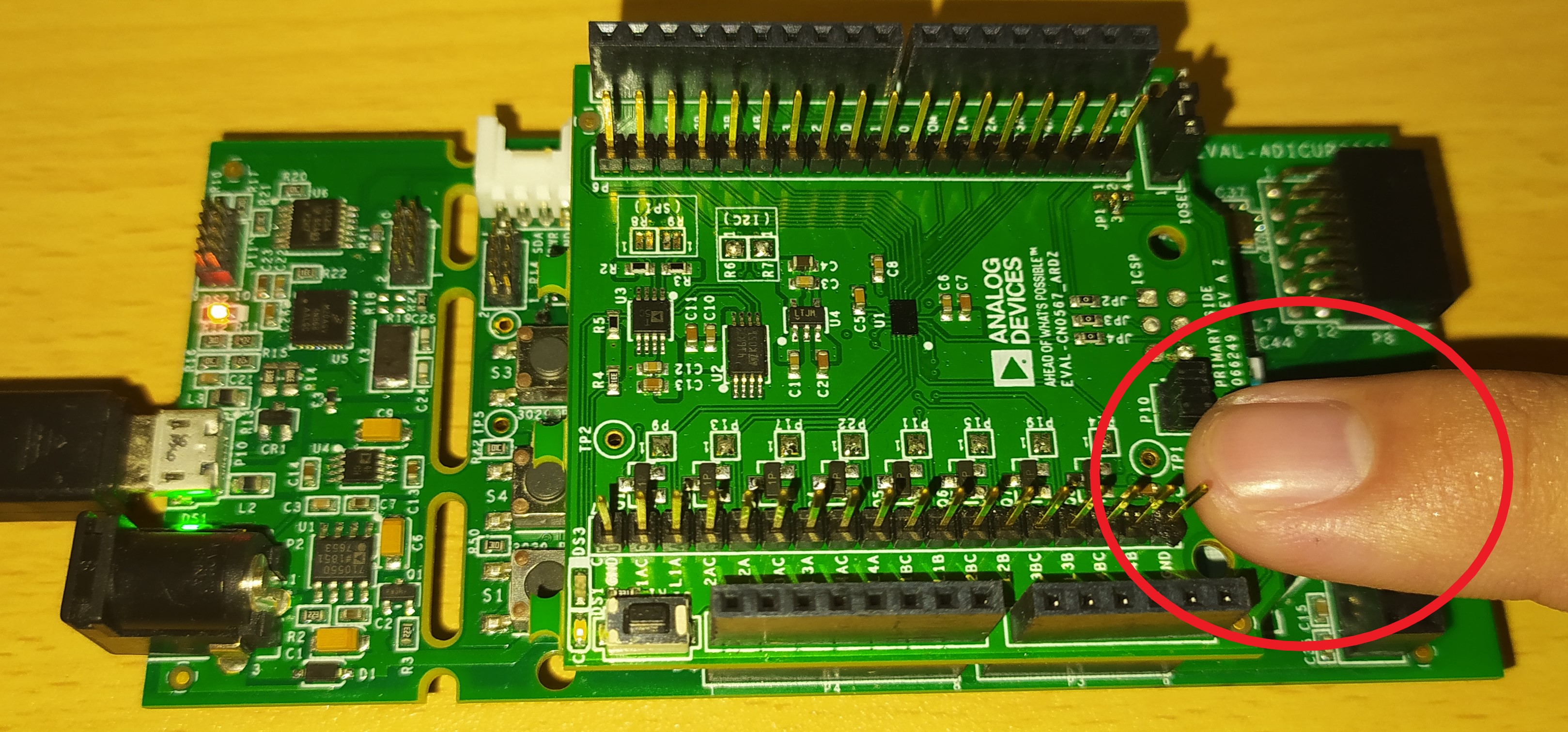 • Connect the EVAL-ADPD410x-ARDZ to the EVAL-ADICUP3029 using the headers shown. See correct Jumper Configuration for both evaluation boards here.