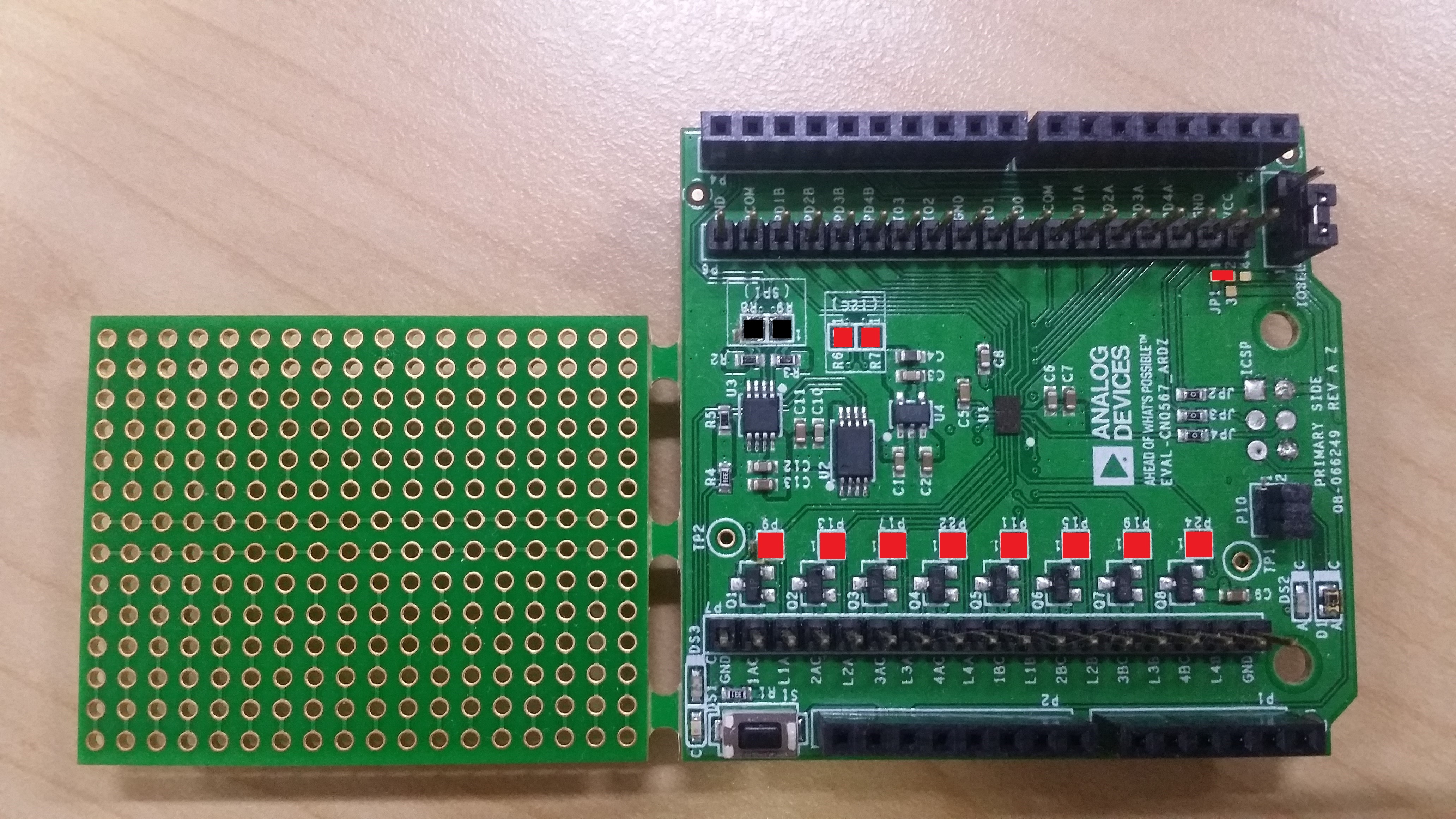 Using the simple test schematic shown in Connection, a test board was fabricated using MOC207M optocouplers. Remove all shunts on jumper header P10 and connect the test jig to the EVAL-ADPD410x-ARDZ, as shown below. (The test jig shown below was fabricated with female headers for easy mounting)