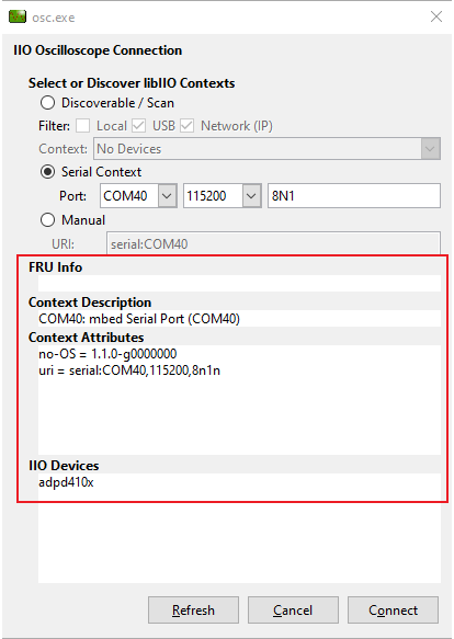 • Install and start IIO-Oscilloscope. There are two options you can use to select IIO contexts. First, you can use the Serial option and input the correct port settings of the board from the Device Manager. Another way is by manually entering the URI used in Connection.