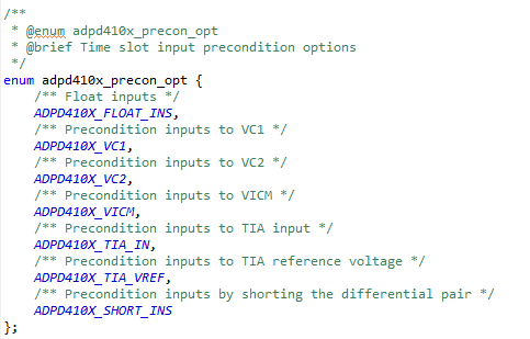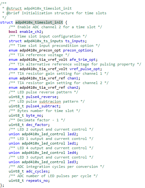 • Initial timeslot settings are configured using the adpd410x_timeslot_init data structure, as shown below: