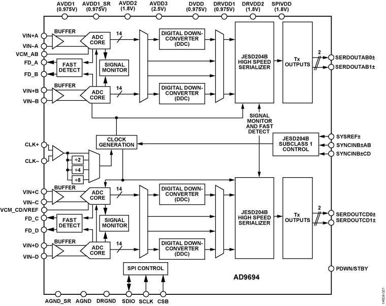 The AD9694-500EBZ is a full-featured evaluation board for the AD9694, a quad, 14-bit, 500 MSPS analog-to-digital converter (ADC) with a JESD204B serial interface. The device is organized as two dual ADC pairs (Pair AB and Pair CD).