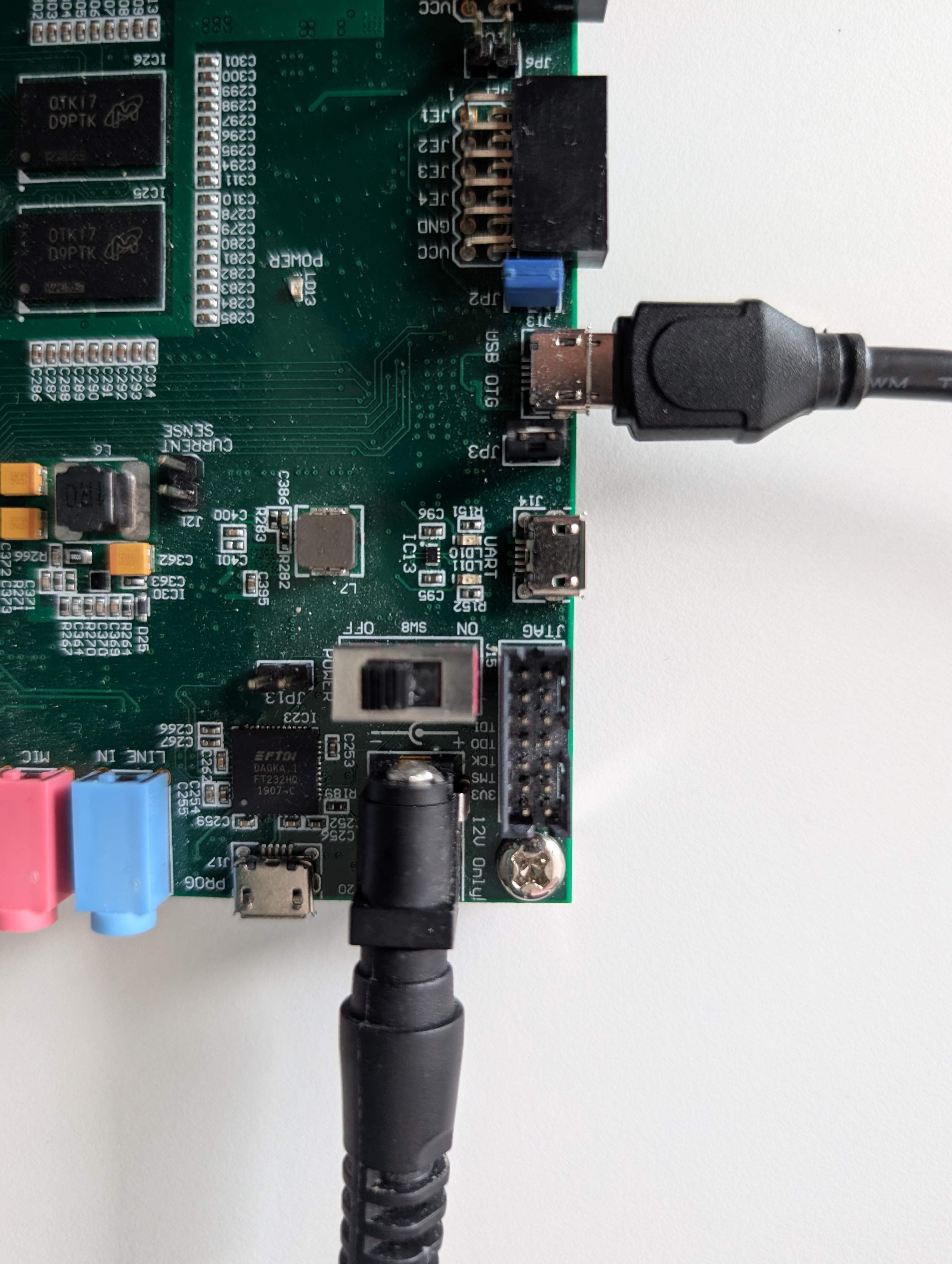 Connect the USB cable from the PC to J13/USB OTG port and the PSU to J20/DC input.