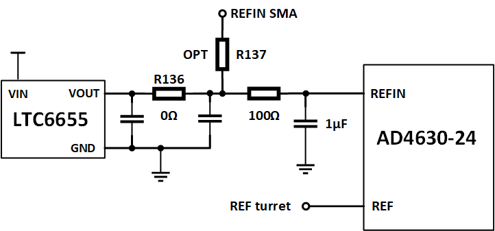 By default, the on-board LTC6655 provides a 5 V reference to the AD4630-24, AD4030-24 and AD4630-16. It drives the REFIN pin of the ADC through an R-C filter (R=100 Ohm, C=1 uF) that reduces low frequency noise. The REFIN pin is connected to an internal buffer, eliminating the need for an external buffer. However, if the user desires to use an external reference that drives the internal buffer, it can be attached to the EXT REF SMA connector (see figure below). R137 should be populated with a zero ohm resistor, and R136 should be open. The internal buffer can be bypassed by attaching an external reference to the REF turret on the board. To reduce the ADC power consumption, the internal reference buffer can be disabled (see respective products data sheet).