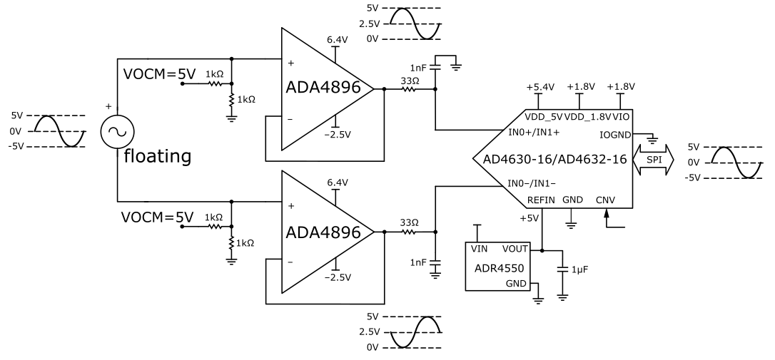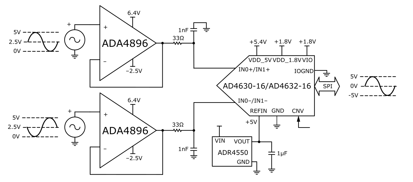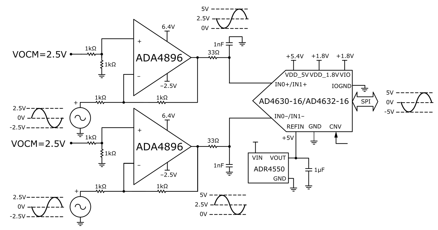 A second topology can be seen in Figure 15. This topology consists of a pair of unity gain buffers, the ADA4896-2. It also can be driven by either a single-ended or differential source. This network is ideal for observing the best noise performance of the AD4630-16, due to the low voltage and current noise of the ADA4896-2 (1 nV/rtHz and 2.8 pA/rtHz, respectively). It also offers a common mode input impedance of 10 MOhm and a wide input common mode voltage range of -4.9 V to +4.1 V (when using +/- 5 V supplies). To use the full span of the ADC the input signal of each buffer needs to be centered at 2.5 V.