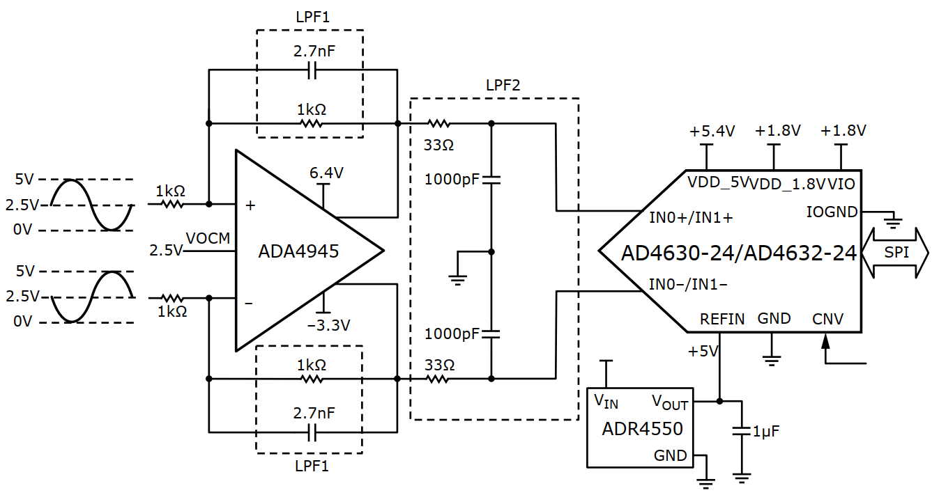 An analog front end (AFE) that provides signal conditioning and drive for the AD4630-24 and AD4630-16. The AFE can be configured to use either the ADA4896-2 in a dual buffer configuration, or the ADA4945-1, a fully differential amplifier.