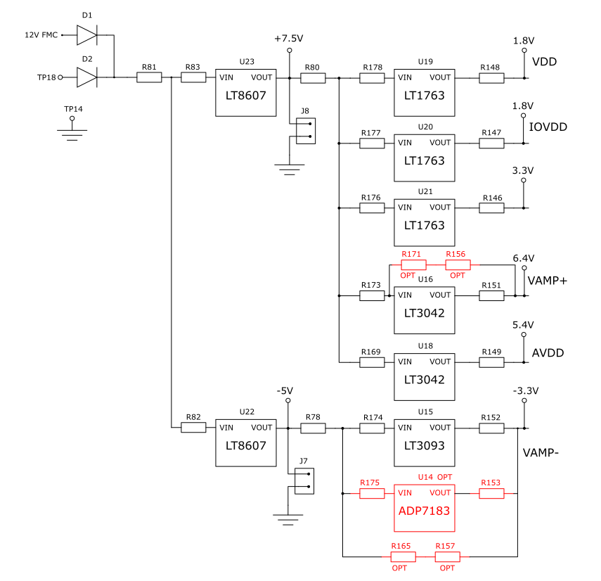 The following block diagram shows all the different power supplies options available in the new evaluation board. If necessary, it is possible to supply all the LDOs directly with external power supplies via J7 and J8. There are also two different options to generate the -3.3 V although only the LT3093 is mounted on the board.