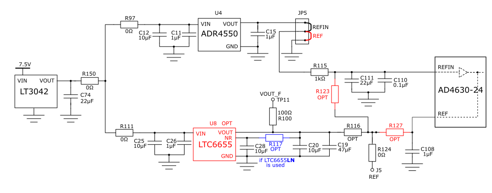 By default, the on-board ADR4550 provides a 5 V reference to the AD4630-24 and AD4630-16. It drives the REFIN pin of the ADC through an R-C filter (R=100 Ohm, C=22 uF) that reduces the low frequency noise. The REFIN pin is connected to an internal buffer, eliminating the need for an external buffer. However, if the user desires to use an external reference that drives the internal buffer, it can be attached to the J5 SMA connector (see figure below). R124 should be populated with a zero ohm resistor, and R116 and R123 should be open. The internal buffer can be bypassed by attaching an external reference to the REF turret on the board. To reduce the ADC power consumption, the internal reference buffer can be disabled (see respective products data sheet). There is also the option to mount the LTC6655 or the LTC6655LN reference which is suitable to use together with the unbuffered input of the ADC.