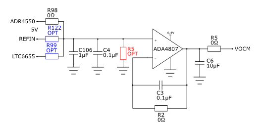 There is one buffer used to generate common mode voltage, U26. The voltage can be adjusted from 0 V to Vref by selecting correctly the ratio between R98, (or R122 or R99) and R5.