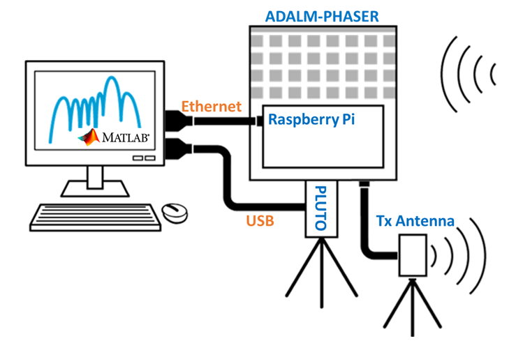 With Phaser connected to your local network or directly to your host machine with MATLAB installed, create an instance of the adi.Phaser class from the command prompt with the IP address of the Raspberry Pi.