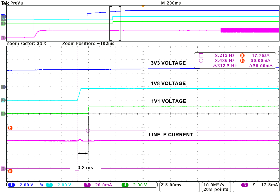 For the same power sequence during power-up, the LINE_P current is capture along with the primary three supply voltages of the signal chain: 3V3, 1V8 and 1V1. The time distance between 3V3 and 1V8 is 186.03ms, between 3V3 and 1V1 is 189.23ms, and zooming in further, the time distance between 1V8 and 1V1 is 3.2ms. The sequence is in correct order for start-up, which is 3V3 first, 1V8 second and 1V1 third or last.