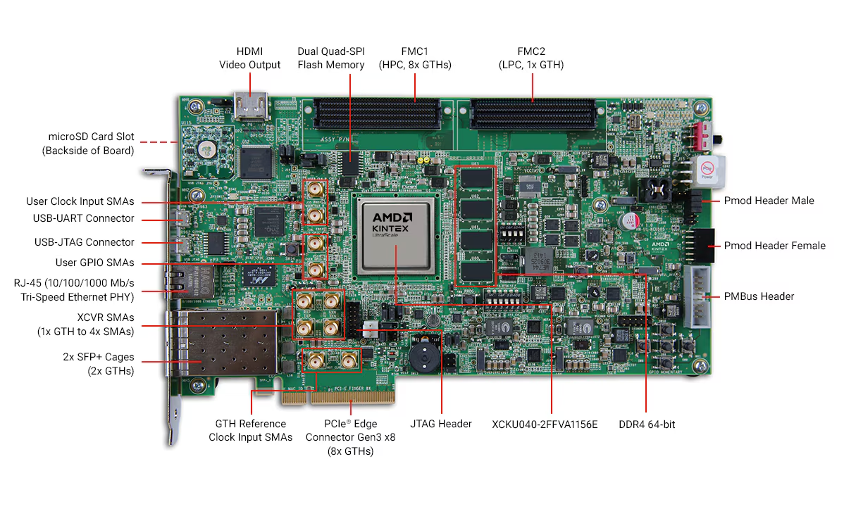 • AMD Xilinx KCU105 FPGA board and its power supply