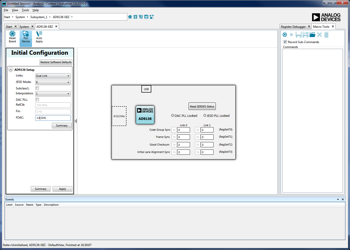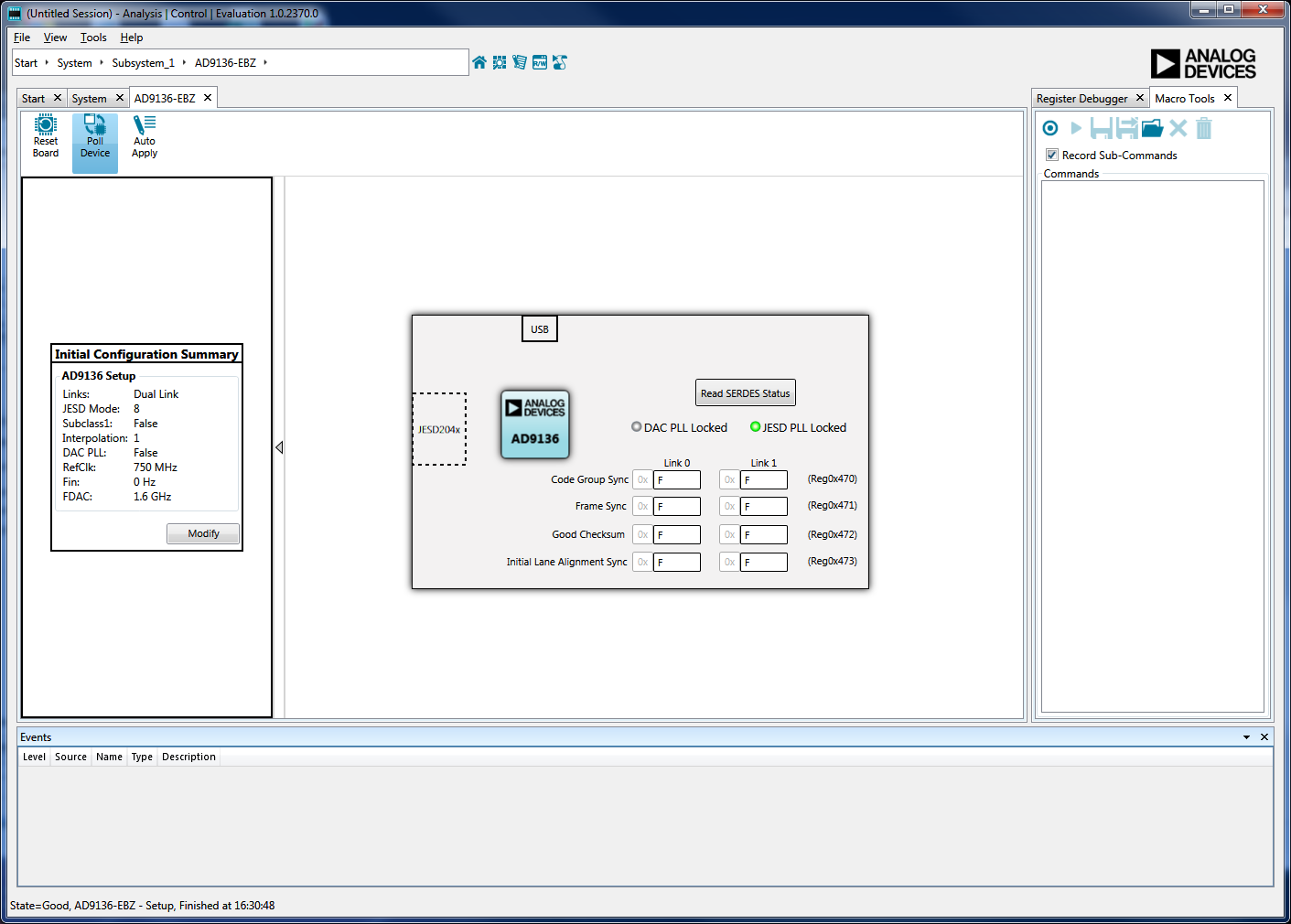 Hit “Apply” and the wizard will execute a startup routine to configure the AD9516 and the AD9136/AD9135. Once complete, the SERDES PLL lock indicator on the board will turn green if it locked and the display will look like Figure 7.