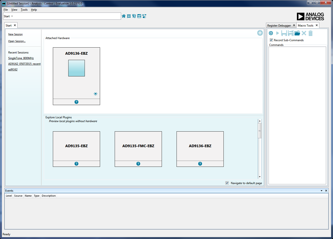 Figure 4 Initial ACE Startup Window with Attached Hardware AD9136-EBZ