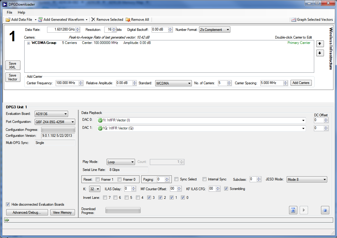 3. Select “QBF 2X4 85G 425M” from the “Port Configuration” drop-down list to configure the DPG for Dual Link and “Mode 8” from the “JESD Mode” drop-down list. 3. Click on “Add Generated Waveform”, and then “Wireless Infrastructure”. A WIFR panel will be added to the vector list. Enter the Data Rate, in this case 1.6GHz and the desired frequency, 100MHz. Enter the digital amplitude. In this case we use 0dBFS. Select “2’s Complement” from the Number Format drop-down list. Input the center frequency of “100MHz” at the bottom of the panel, choose “WCDMA” from the Standard drop-down menu and increase the No. of Carriers to “4” - then hit the “Add Carriers” button. The DPG Downloader panel should look like Figure 3. 4. Select the WIFR vector (I) in the “DAC0” drop down menu and the WIFR vector (Q) in the “DAC1”. At this point, the DPG Downloader panel should look like Figure 4.