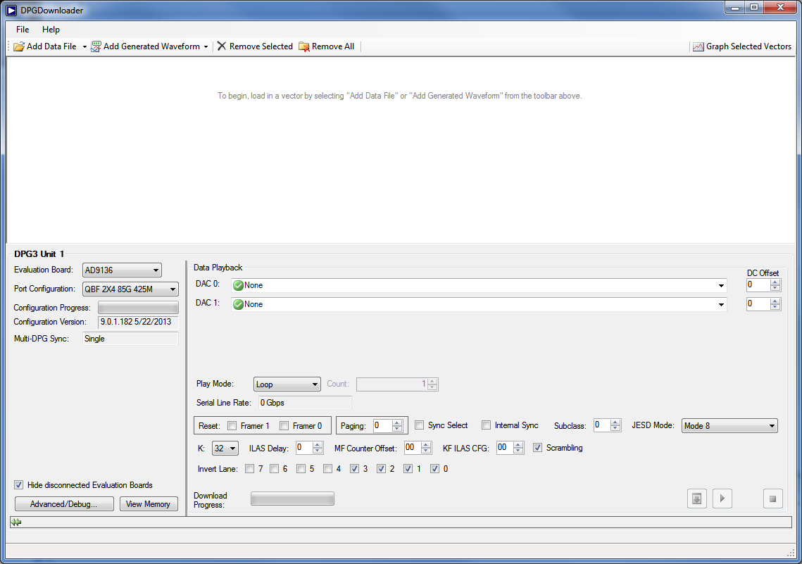 Open DPG Downloader if you have not done so. (Start > All Programs > Analog Devices > DPG > DPGDownloader). Ensure that the program detects the AD9136/AD9135, as indicated in the “Evaluation Board” drop-down list, shown in Figure 3.