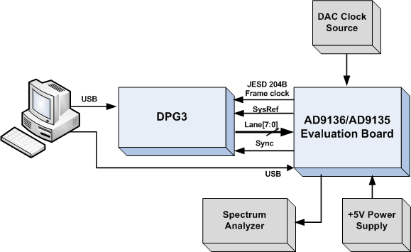 Connect +5.0V to P5, GND to P6. A low phase noise high frequency clock source should be connected to the SMA connector, J1. This is the DACCLK input. The spectrum analyzer should be connected to the SMA connector, J17. This is the DAC0 output. The evaluation board connects to the DPG3 through the connector P4. The PC should be connected to the EVB using the mini-USB connector XP2 after installation of the Evaluation Board software. Figure 1 shows the block diagram of the set-up.