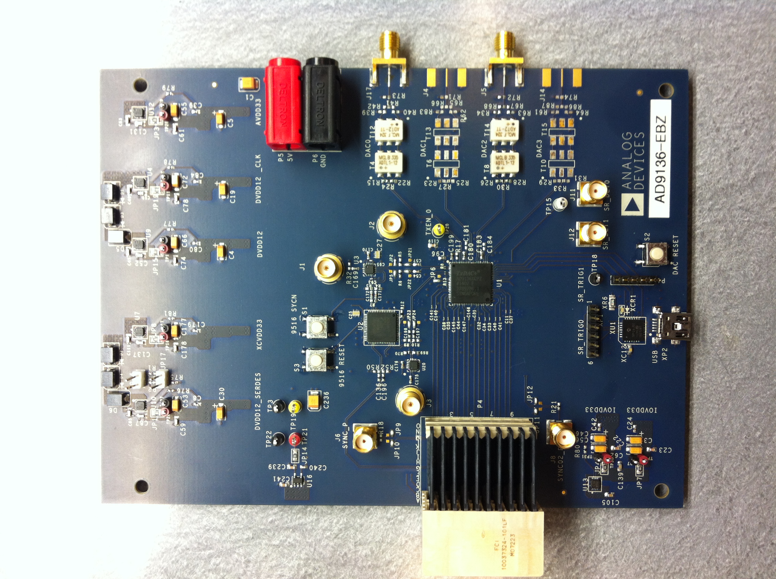 The AD9136/AD9135-EBZ connects to a DPG3 for quick evaluation of the AD9136/AD9135, a high-speed, signal processing Digital to Analog Converter. The DPG3 automatically formats the data and sends it to the AD9136/AD9135-EBZ, simplifying evaluation of the device. The Evaluation Board (EVB) runs from a +5V supply. A clock distribution chip AD9516 is included on this EVB as a clock fan-out and frequency divider for the DACCLK, REFCLK and DPG3 input clock. Figure 2 is an image of the top side of the AD9136-EBZ.