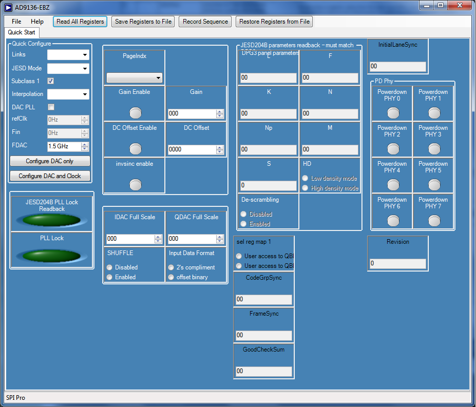 Open the AD9136/AD9135 SPI application (Start > All Programs > Analog Devices > AD9136/AD9135 > AD9136/AD9135 SPI). The screen should look similar to Figure 10.