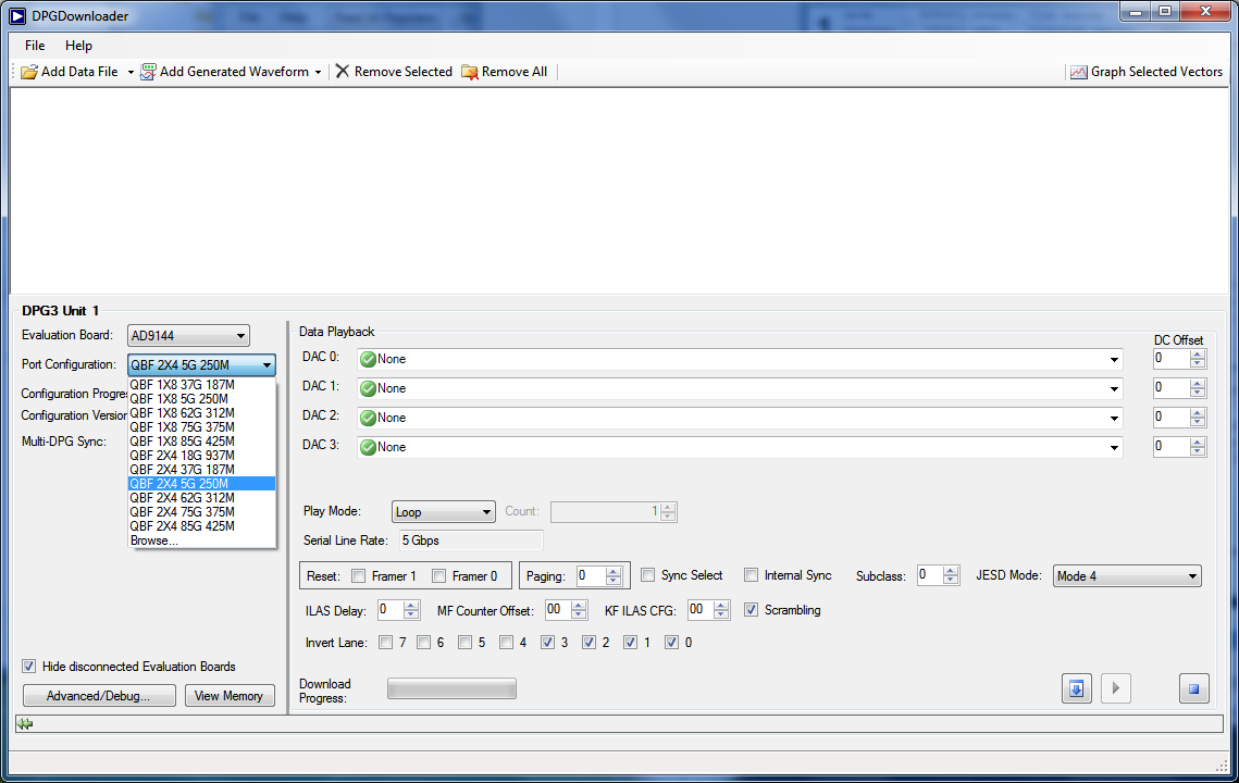 Open DPG Downloader if you have not done so. (Start > All Programs > Analog Devices > DPG > DPGDownloader). Ensure that the program detects the AD9144, as indicated in the “Evaluation Board” drop-down list and select the “QBF 2X4 5G 250M” option from the “Port Configuration” drop-down list. The “Serial Line Rate” window will show the incorrect clock rate until after the SPI software has been started; then it will change to the correct frequency. The DPG Downloader panel should look like Figure 3.