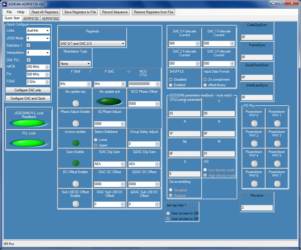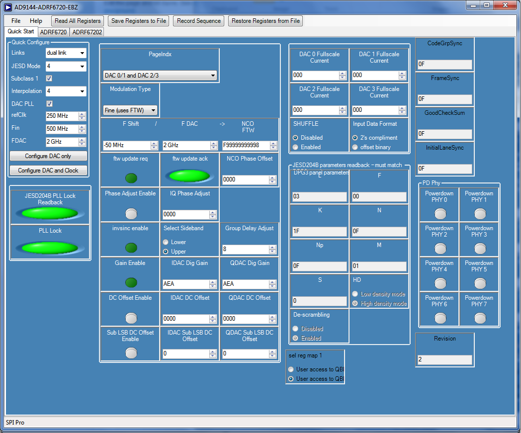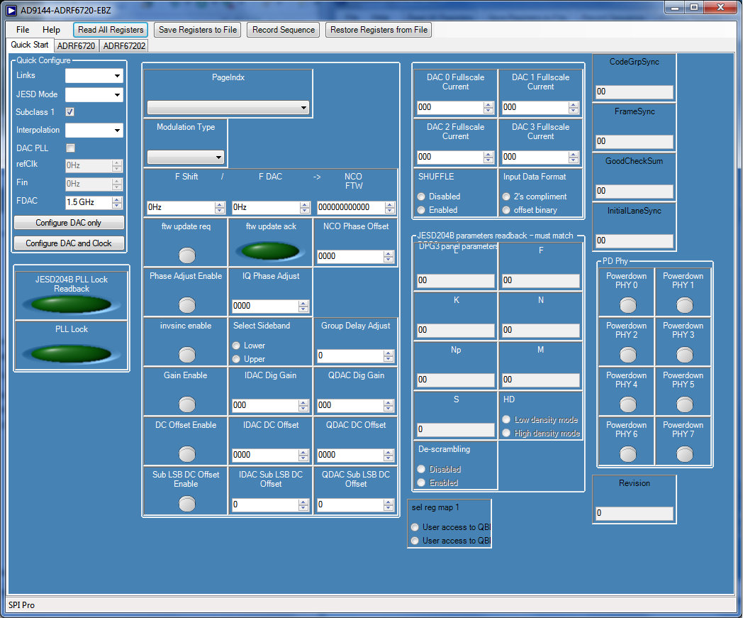 Open the AD9144-6720 SPI application (Start > All Programs > Analog Devices > AD9144 > AD9144 SPI). The screen should look similar to Figure 5.