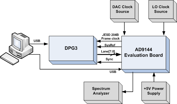 Connect +5.0V to P5, GND to P6. One low phase noise high frequency clock source should be connected to the SMA connector, J1. J1 is the clock input of the AD9516, whose outputs feed into the DAC and the DPG3. The other low phase noise high frequency clock source should be connected to the SMA connector, J18 (the ADRF6720-1 LO input), and the spectrum analyzer should be connected to the SMA connector, J4 (the ADRF6720-1 RF1 output) or J14 (the ADRF6720-2 RF2 output) . The default settings for ADRF6720-1 feeds the LO to the other AQM ADRF6720-2. The evaluation board connects to the DPG3 through the connectors P4. The PC should be connected to the EVB using the mini-USB connector XP2 after installation of the Evaluation Board software. Figure 1 shows the block diagram of the set-up.