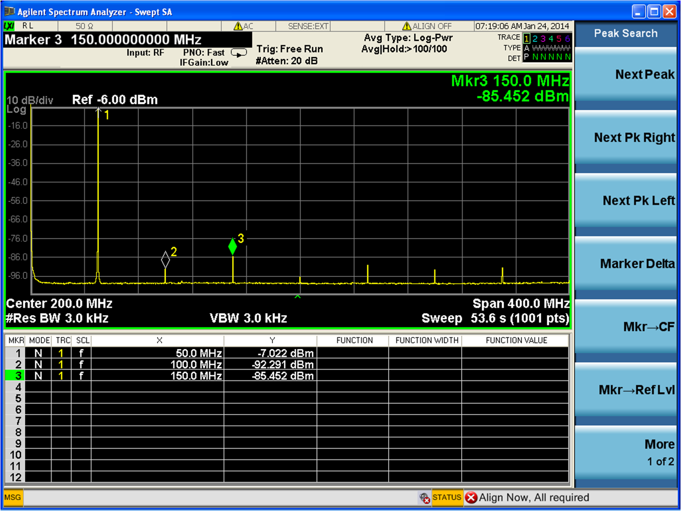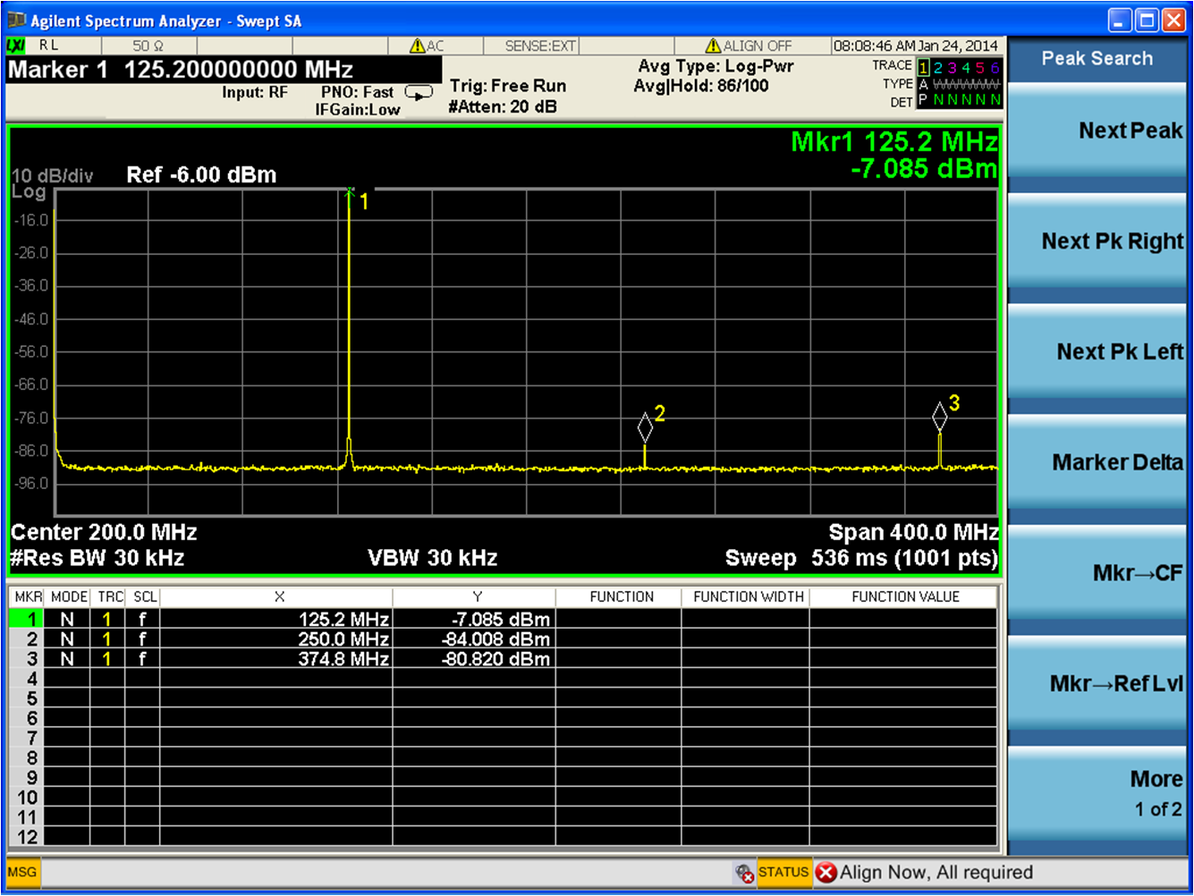 Configure the hardware according to the hardware set-up instructions given in the Hardware Setup section above. Set the frequency of the DAC clock signal generator to 250MHz for AD9516 clock input (divides down to 125MHz for the RefClk frequency), and the output level to 3dBm. The spectrum analyzer can be configured with Center Frequency = 200 MHz, Span = 400 MHz, and Resolution Bandwidth of 30 kHz. Choose Input Attenuation to be 20dB. This can be adjusted later if indications are that the analyzer is causing degradations.