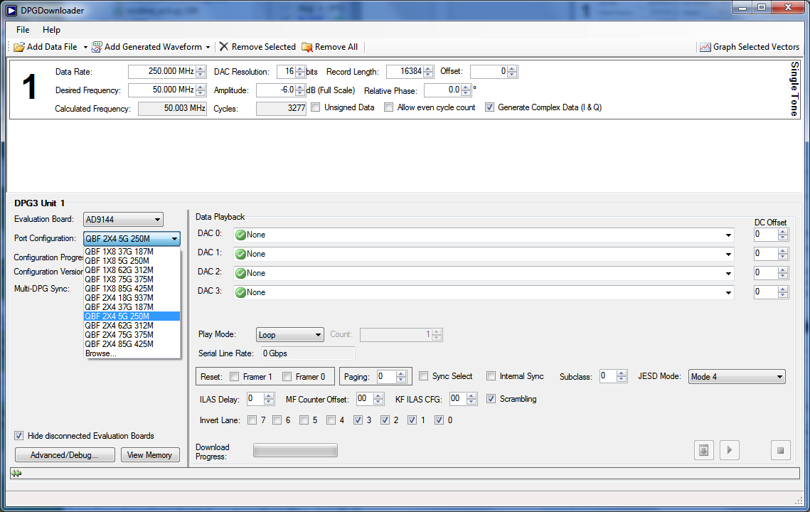 Single-Tone Test using DAC PLL==== These settings configure the AD9144 to output a sine wave using the DPG3 and allow the user to view the single-tone performance at the DAC output, under the condition: Fdata