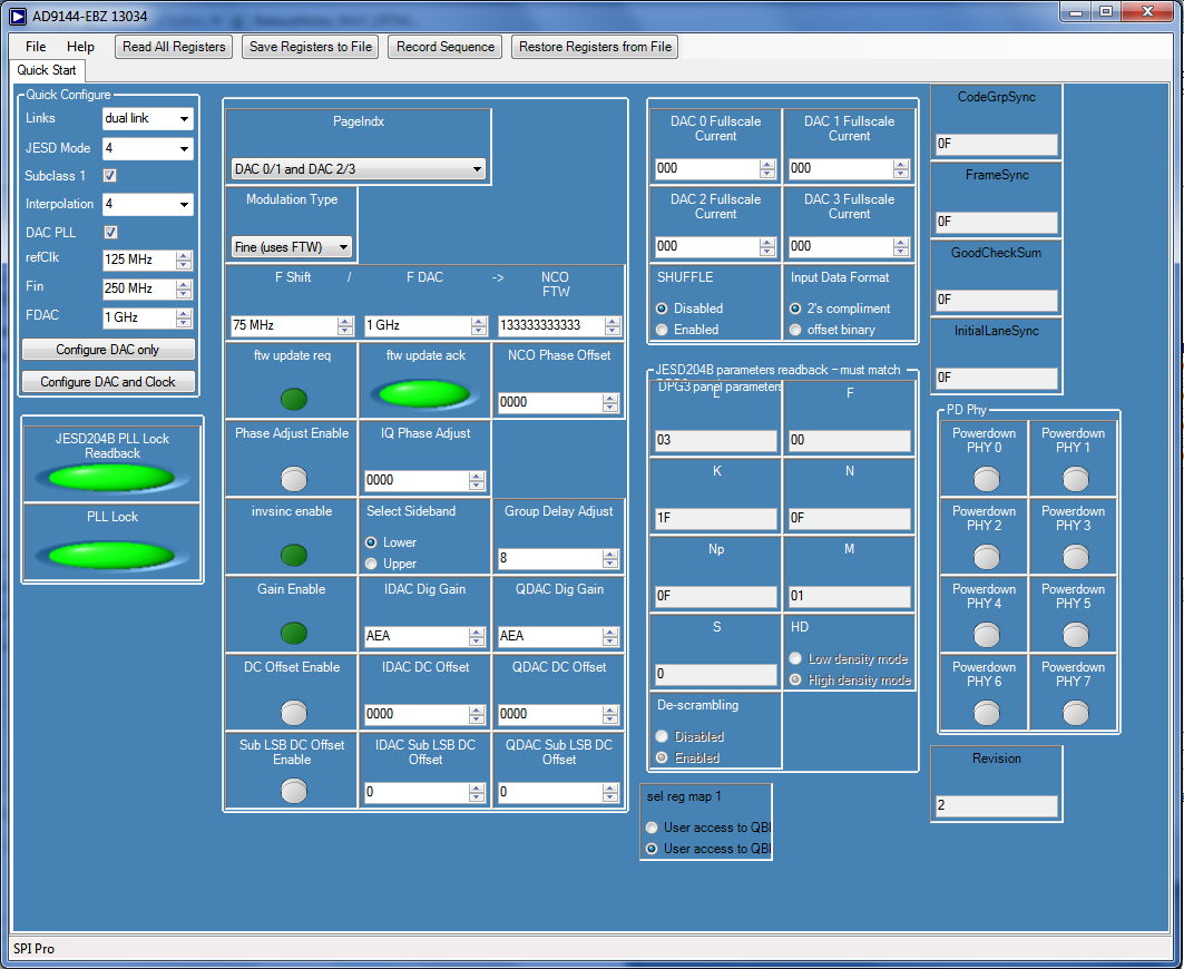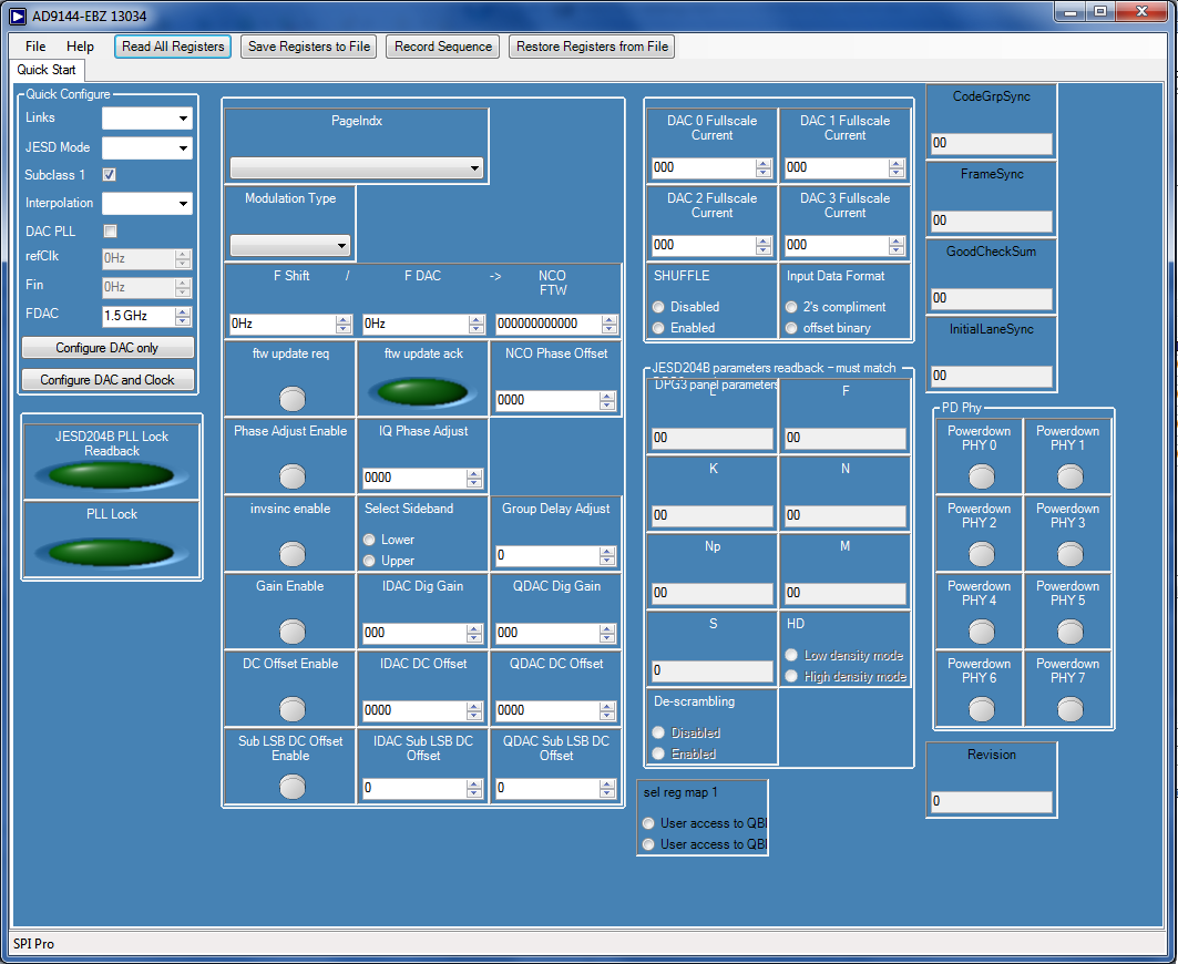 Click “Read All Registers” in the top menu bar. You should see “JESD204B PLL Lock Readback” LED readback is bright green indicating that the SERDES PLL is locked. Similarly the DAC PLL is locked when the “PLL Lock” LED is bright green.