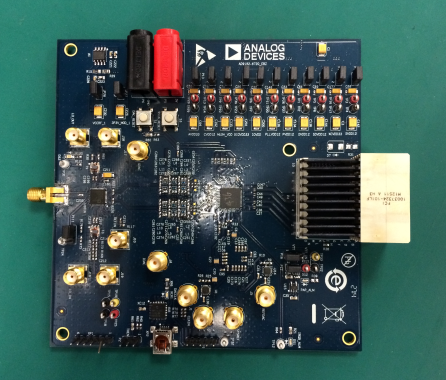 The AD9152-ADRF6720-EBZ connects to a DPG3 for quick evaluation of the AD9152, a high-speed, signal processing Digital to Analog Converter. The DPG3 automatically formats the data and sends it to the AD9152-ADRF6720-EBZ, simplifying evaluation of the device. The Evaluation Board (EVB) runs from a +5V supply. A clock distribution chip AD9516 is included on this EVB as a clock fan-out and frequency divider for the DACCLK, REFCLK and DPG3 input clock. Figure 2 is an image of the top side of the AD9152-ADRF6720-EBZ.