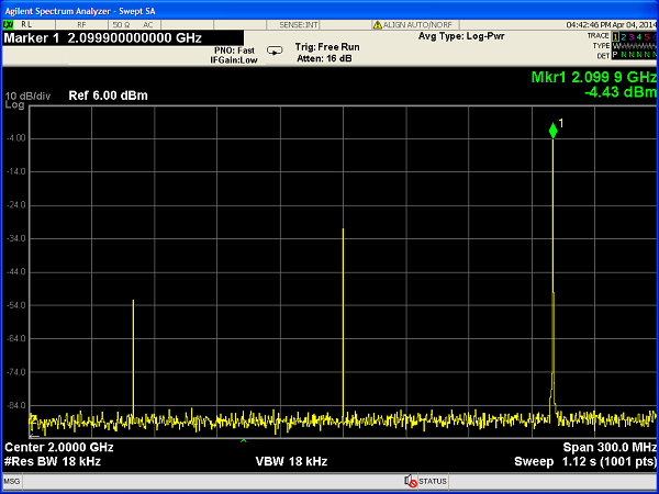 Configure the hardware according to the hardware set-up instructions given in the Hardware Setup section above. Set the frequency of the DAC clock signal generator to 1.5GHz, and the output level to +3dBm. The spectrum analyzer can be configured with Start Frequency = 10 MHz, Stop Frequency = 1.5GHz, and Resolution Bandwidth of 30 kHz. Choose Input Attenuation to be 10dB. This can be adjusted later if indications are that the analyzer is causing degradations.
