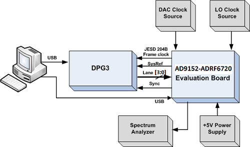 Connect +5.0V to P5, GND to P6. A low phase noise high frequency clock source should be connected to the SMA connector, J1. This is the DACCLK input. The spectrum analyzer should be connected to the SMA connector, J17/J4 They are the DAC0 output. The External LO should be connected to the SMA connector of J18. The evaluation board connects to the DPG3 through the connector P4. The PC should be connected to the EVB using the mini-USB connector XP2 after installation of the Evaluation Board software. Figure 1 shows the block diagram of the set-up.