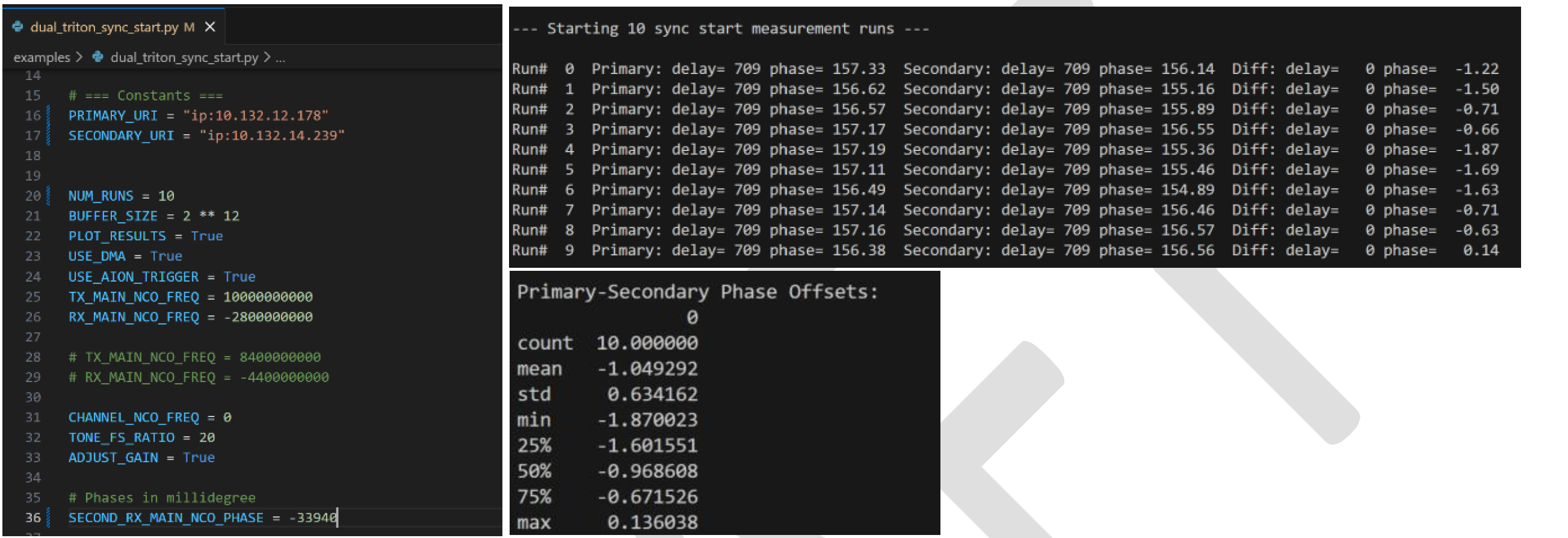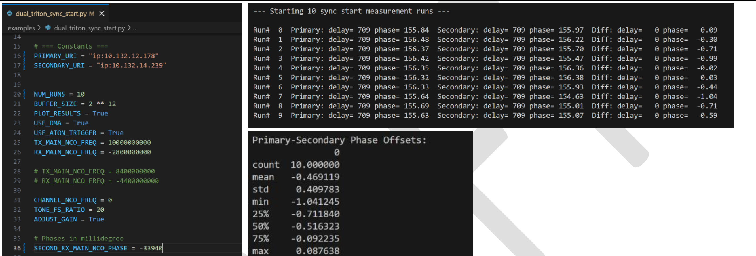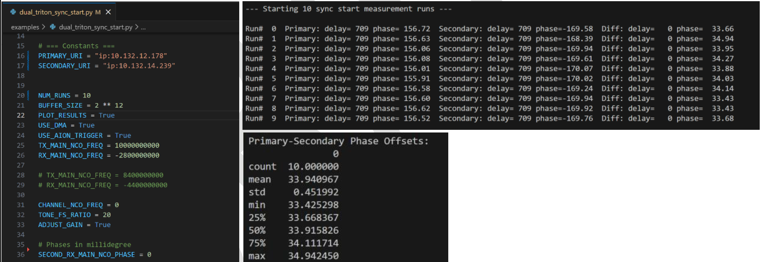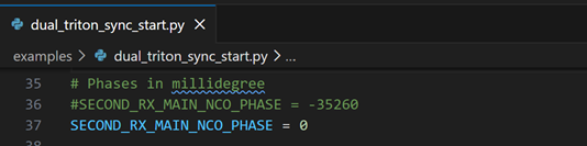 We can see on the screenshots below, “SECOND_RX_MAIN_NCO_PHASE = 0” and when we execute the python script, we can see that the Phase delta between the Primary and Secondary Triton Platforms has a mean value of 33.94 degrees