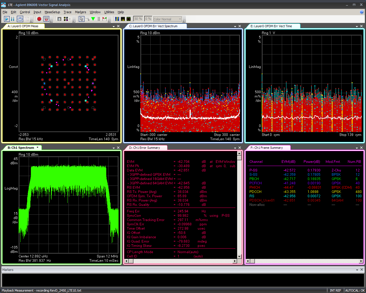 • EVM of single 64QAM PRB (for 1.4 MHz, 3 MHz, 5 MHz, 10 MHz, 15 MHz, and 20 MHz channels) at max and min powers