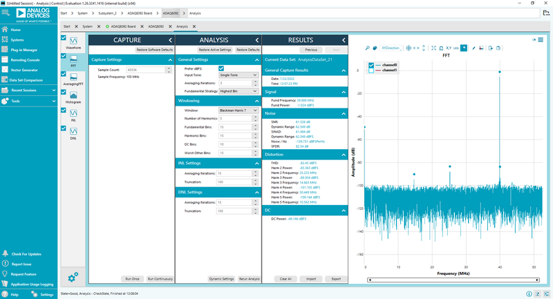 • In the ANALYSIS pane, the user can change the “windowing” type of the FFT, and also the “average iterations” when capturing the INL and DNL performance. When measuring the INL and DNL, the user should use the “Run Continuously” function and wait until it reaches the number of “average iterations” placed.