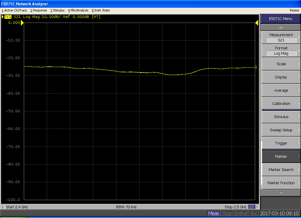 Running an S21 test on the E5071C will broadcast a tone from one antenna (on port 2), and receive it on the other (port 1), and plot the results (in dB) compared to a wire that was used during the calibration on the instrument. It’s interesting note that we are measuring both Rx and Tx capabilities. It is possible that the Rx at sub 600MHz could be fine, and it is just a Tx problem (unlikely, but I just wanted to point it out).