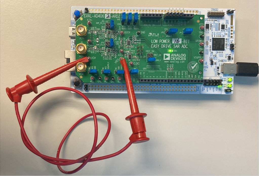 If no signal generator is available, a jumper cable between the VREF and VCM test points can be used to bias the AD4060/ AD4062 analog inputs to VREF. This is preferred over connecting the amplifier inputs to GND, because the amplifier VEE rails are connected to GND by default.