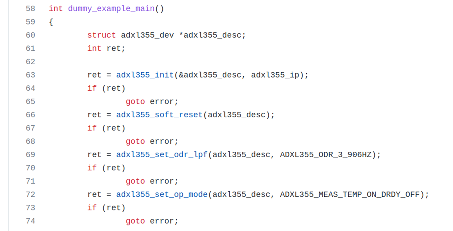 • Standardized driver structure: All no-OS drivers follow a consistent pattern with init(), remove(), and device-specific functions, making it easy to learn and use new drivers.