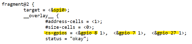 Under a section of code labeled “fragment@2”, you’ll see 3 main sections: adar1000@0, adar1000@1, and adf4159@2. And it seems like these 3 devices are all going to use the Raspberry Pi’s spi0 bus. And have their SPI CS pin controlled by GPIO 8, 7, and 27 (respectively for the 3 devices).