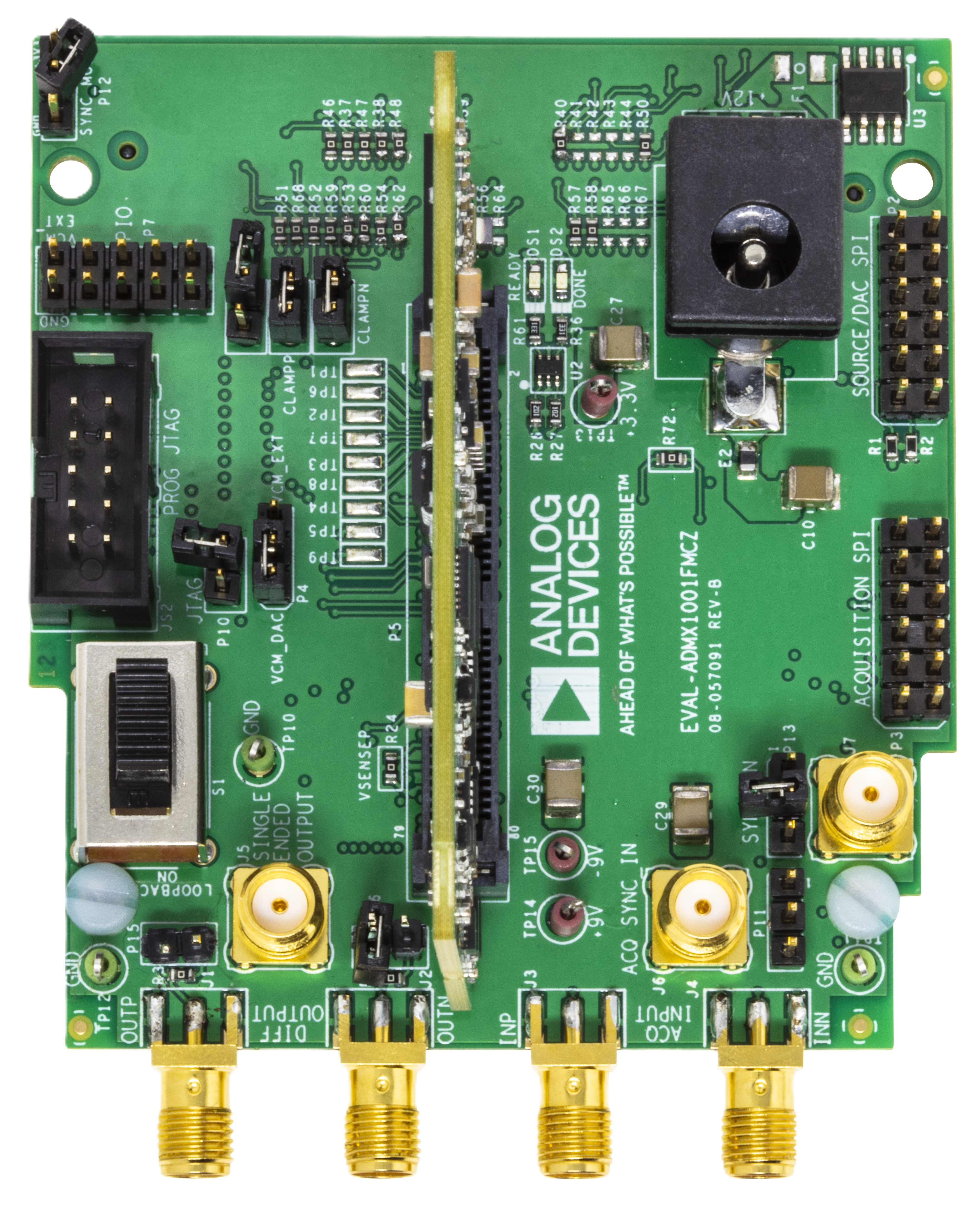 The EVAL-ADMX100X-FMCZ is an evaluation board for the ADMX1001 and ADMX1002 ultra-low distortion, low-noise signal generator modules from Analog Devices. The EVAL-ADMX100X-FMCZ evaluation board provides the necessary interface circuitry to connect the ADMX100X module to a host PC via the SDP-H1 controller board, or alternatively via the SDP-S or SDP-B controller boards with the SDP-I-PMOD interposer.
