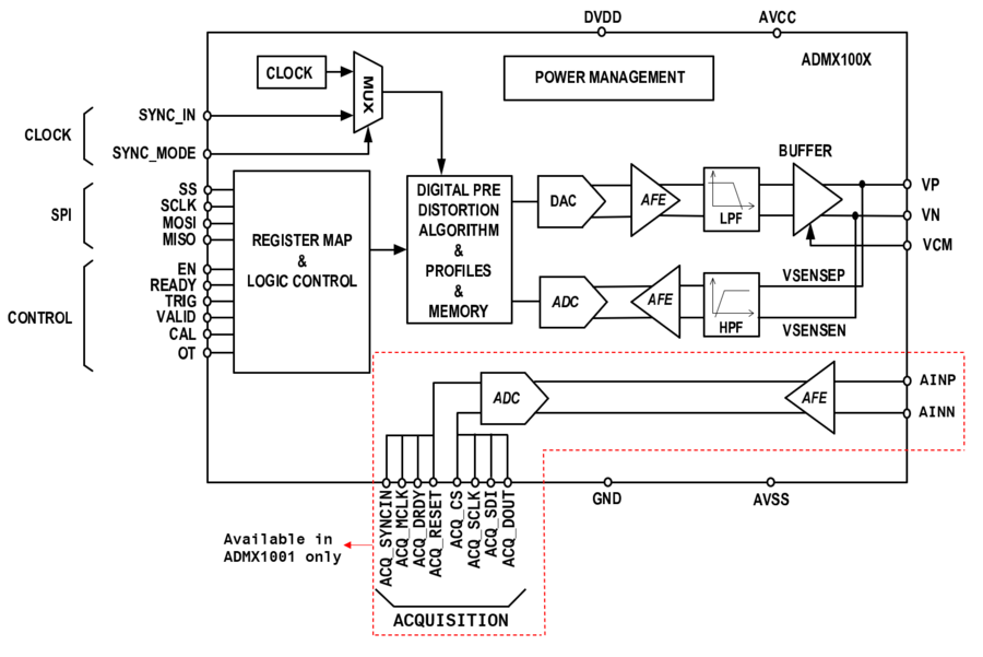 The ADMX1001 uniquely includes a differential input acquisition channel to measure a signal of choice, while the ADMX1002 focuses solely on signal generation.