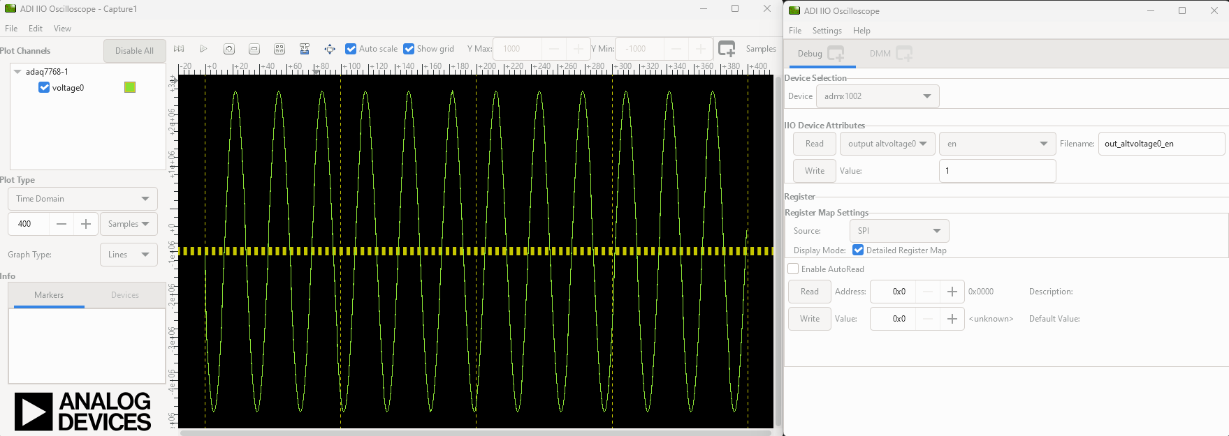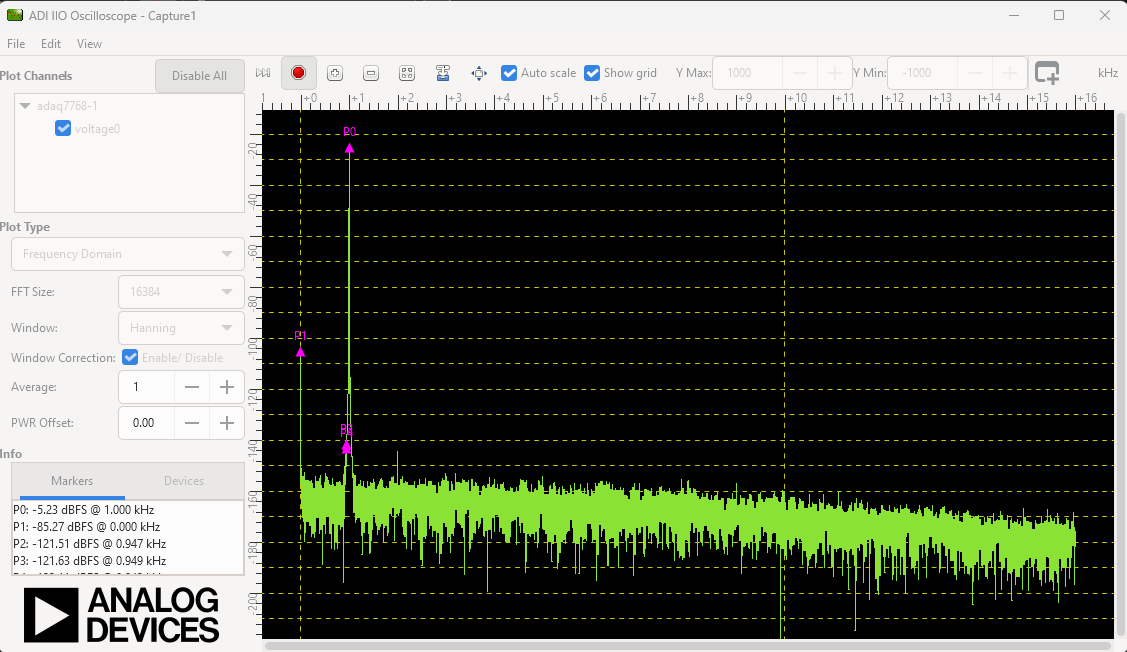 Refreshto display available IIO Devices and pressConnect.After the board is connected and a channel is enabled, hit the play button. The data capture window can be seen like in the shown picture.