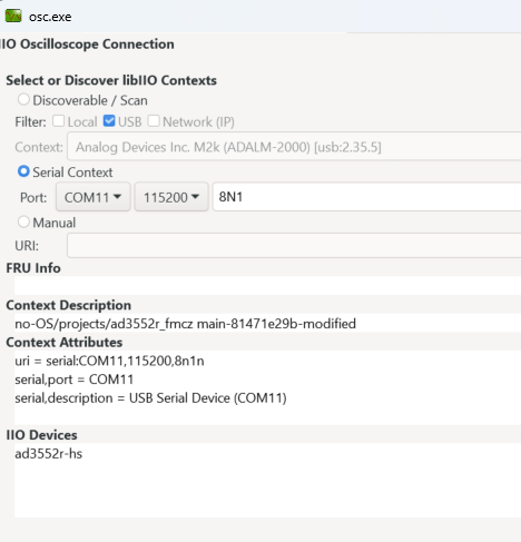 Hey, welcome to ad3552r_fmcz AXI example tx_clkgen: MMCM-PLL locked (133000000 Hz) ad3552r_core: Successfully initialized (133332824 Hz) Running IIOD server... If successful, you may connect an IIO client application by: 1. Disconnecting the serial terminal you use to view this message. 2. Connecting the IIO client application using the serial backend: Baudrate: 115200 Data size: 8 bits Parity: none Stop bits: 1 Flow control: noneClose the serial terminal, then connect IIO Oscilloscope using the serial backend.