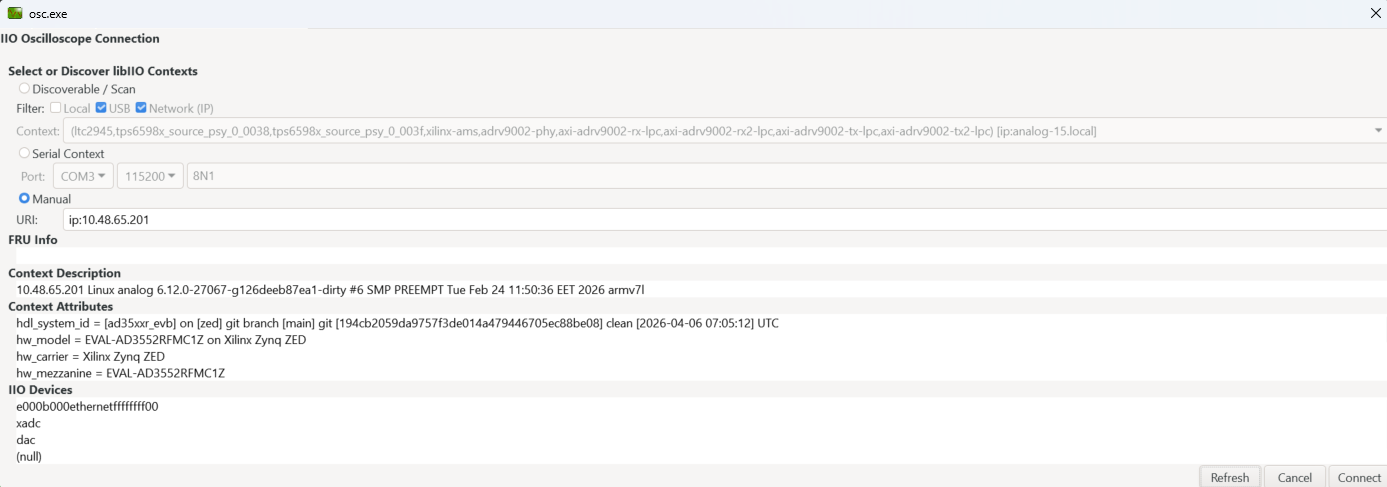 iio_info -u ip:<ip-address-of-zedboard>from the host PC.Click Refresh to populate the device list, then click Connect.