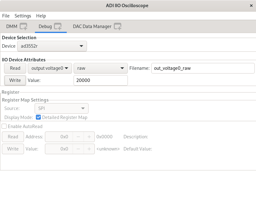 axi-ad3552rdevice. You can set raw output codes for each channel or configure DDS tone generation.