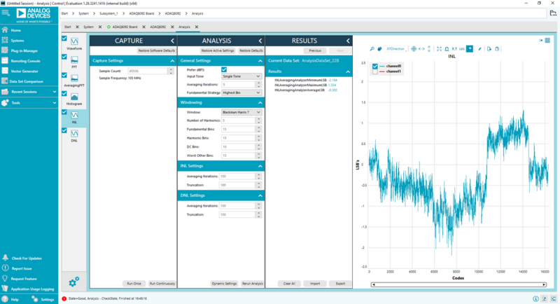 • In the ANALYSIS pane, the user can change the “windowing” type of the FFT, and also the “average iterations” when capturing the INL and DNL performance. When measuring the INL and DNL, the user should use the “Run Continuously” function and wait until it reaches the number of “average iterations” placed.