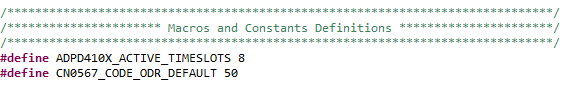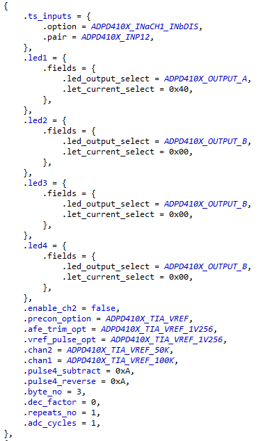 • Initial timeslot settings are configured using the adpd410x_timeslot_init data structure, as shown below: