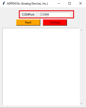 • Run the example script using the command: ...\pyadi-iio\examples> python adpd410x_test.py