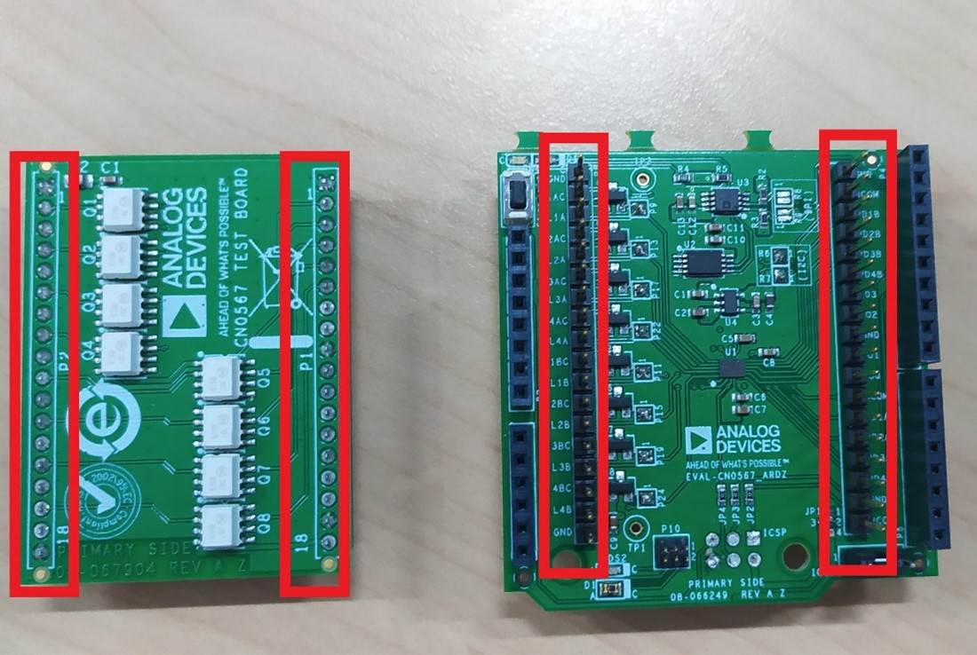Using the simple test schematic shown in Connection, a test board was fabricated using MOC207M optocouplers. Remove all shunts on jumper header P10 and connect the test jig to the EVAL-ADPD410x-ARDZ, as shown below. (The test jig shown below was fabricated with female headers for easy mounting)